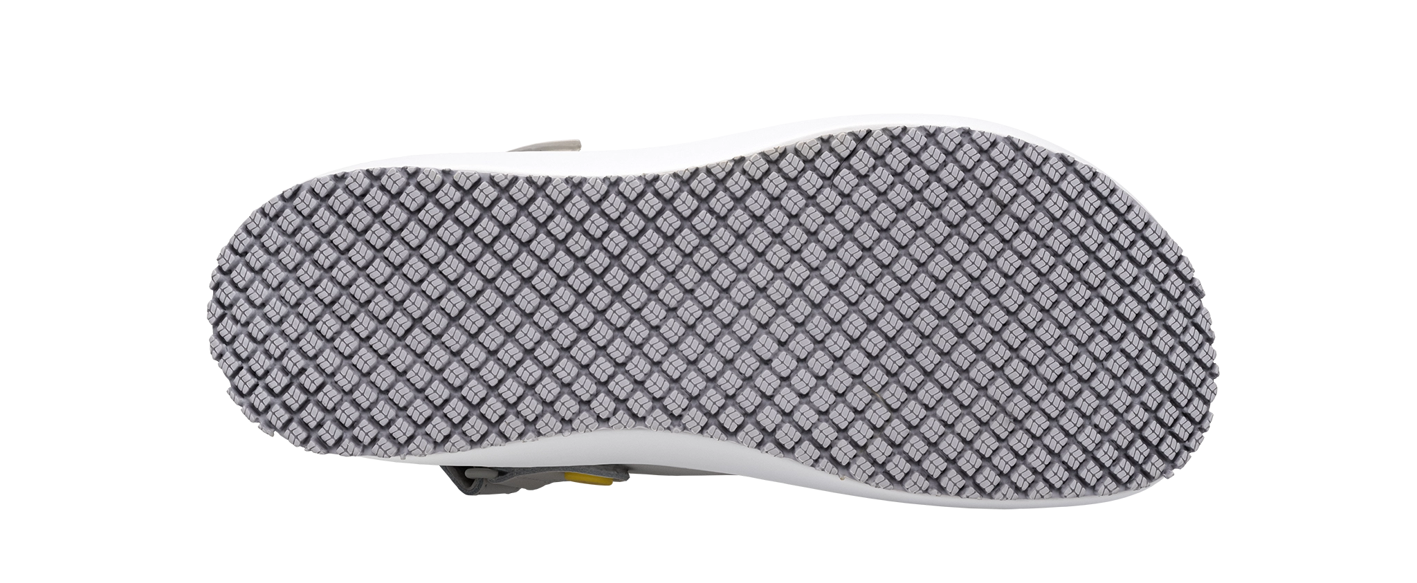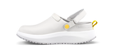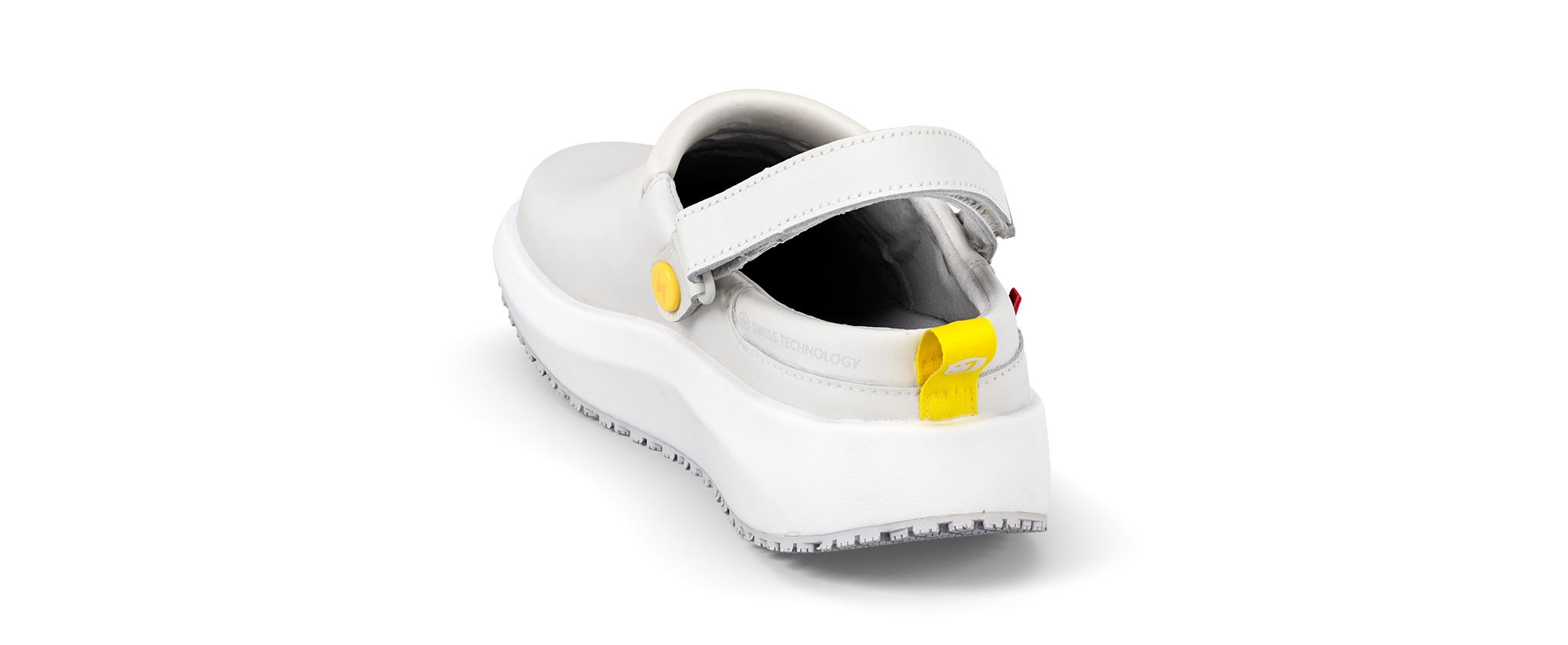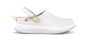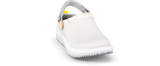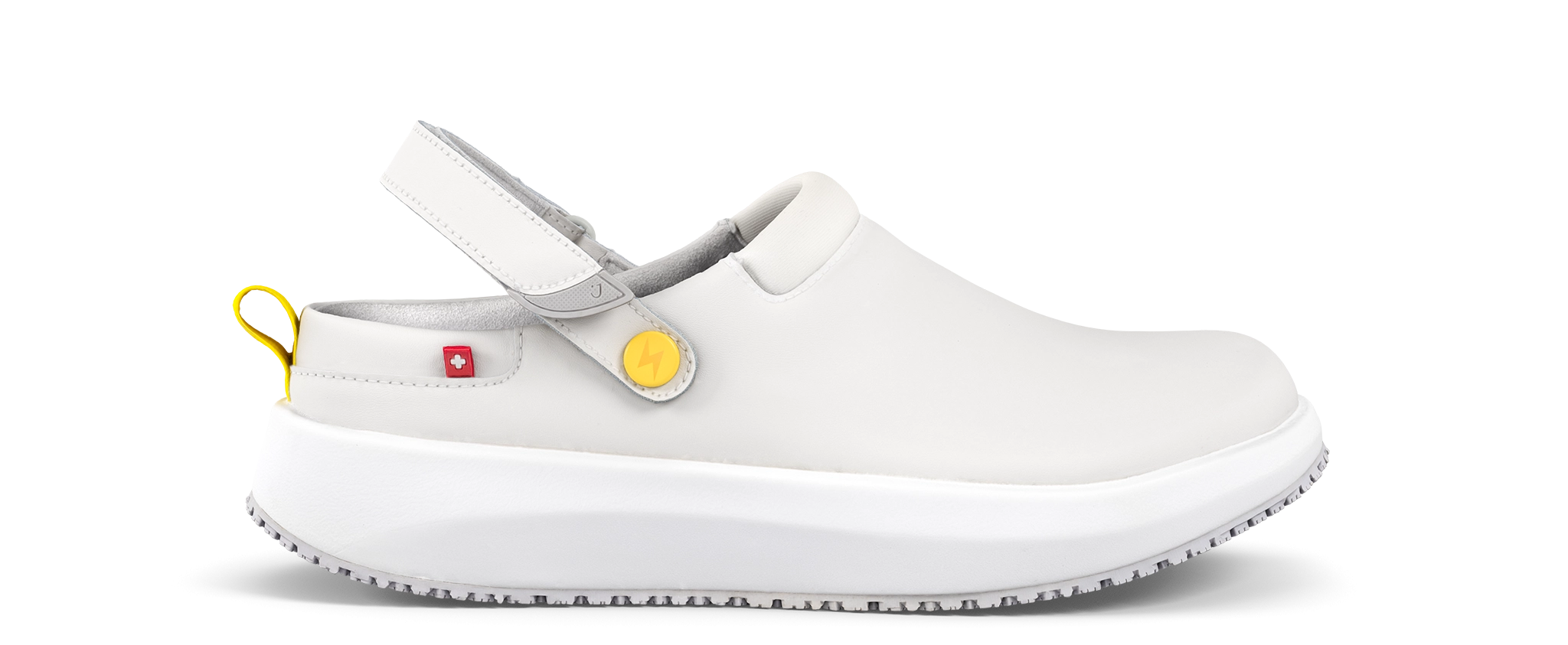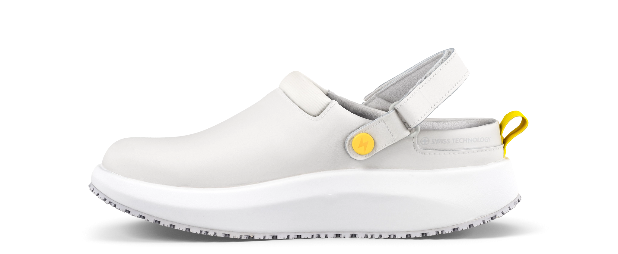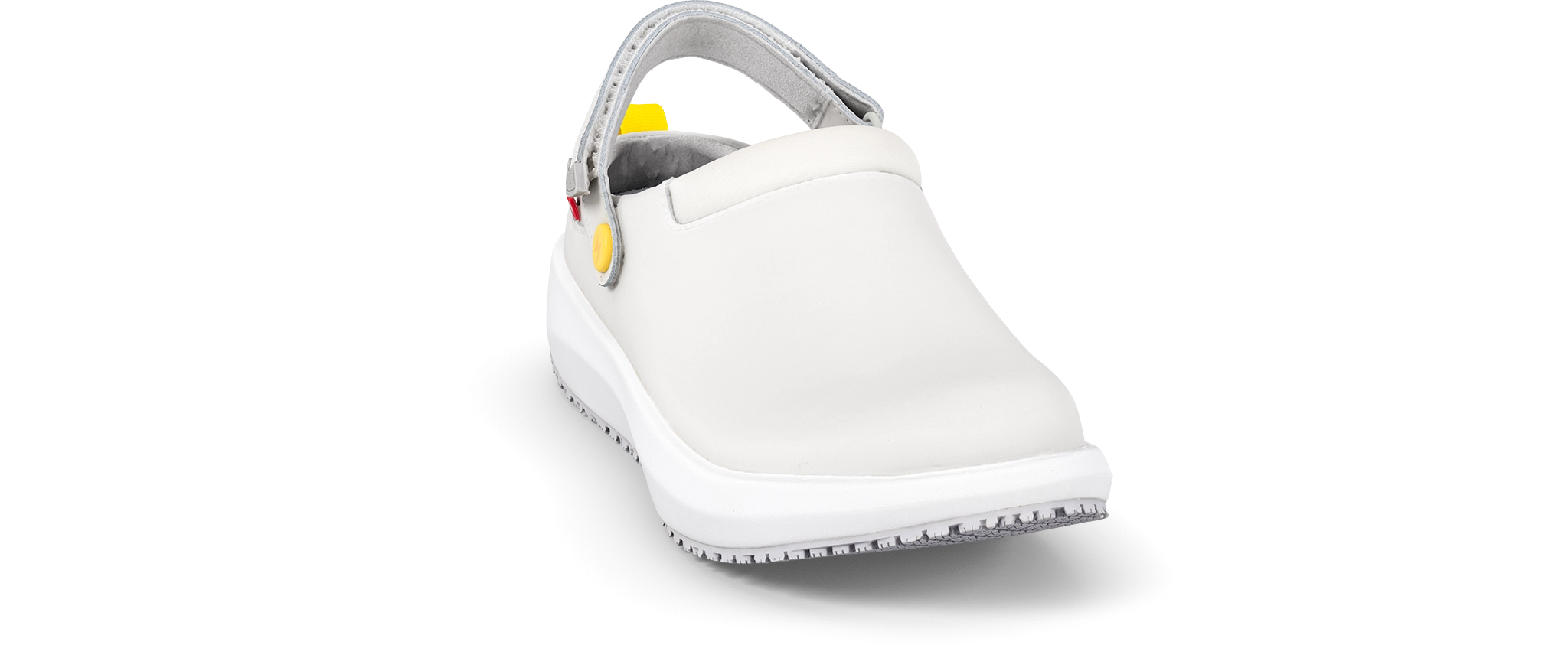Ace ESD white: Professional clog with adjustable velcro backstrap, leather and textile lining and softly padded collar. The conductive footbed and sole provide ElectroStatic Discharge into the ground and protect against the dangers of static build-up in the workplace. Featured with the Joya Senso sole technology that ensures excellent cushioning effect and balanced pressure distribution, and delivers optimum comfort and relief for your back muscles, joints and feet daily stress.